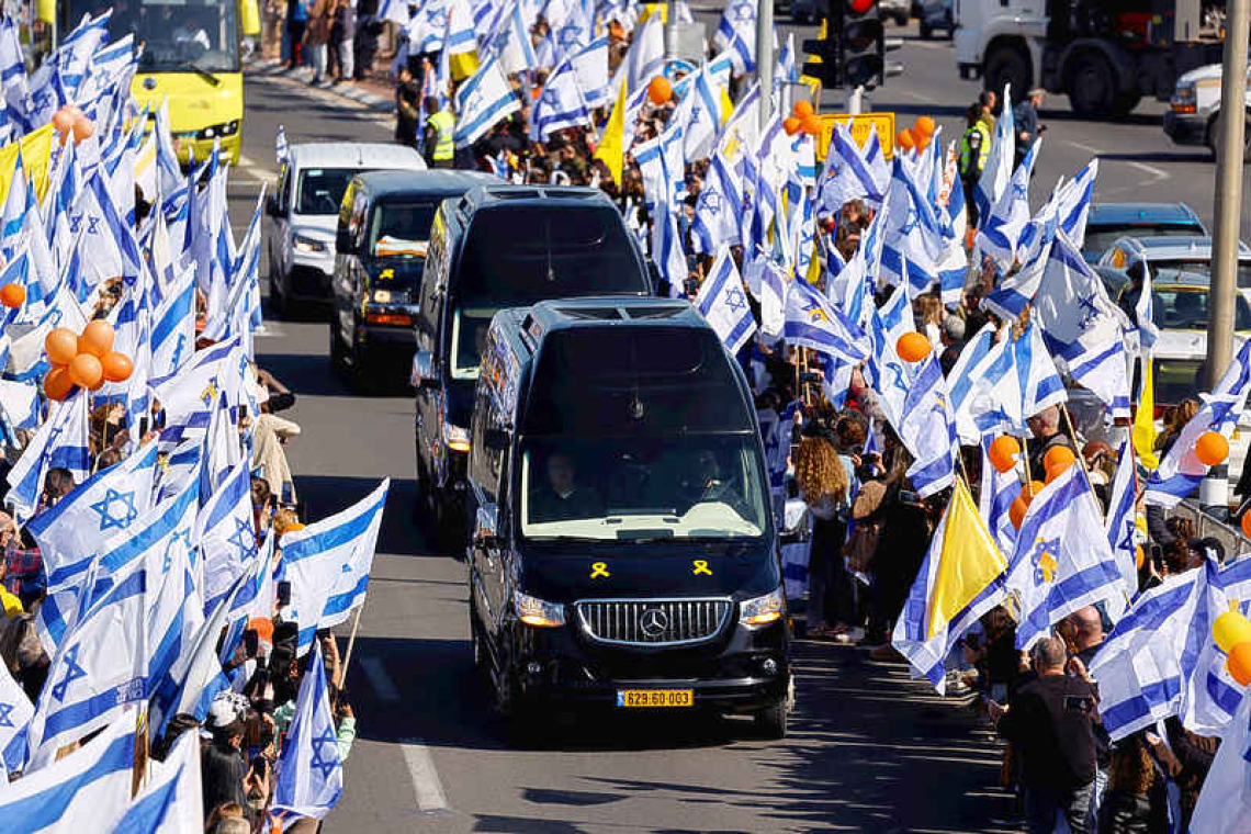 Thousands of people, some in tears, carrying blue and white Israeli flags or photographs of the family, walked in procession or waited as a convoy bearing the coffins drove past. Many were carrying orange balloons, a symbol of mourning for the hostages, matching the red hair of the two Bibas boys.