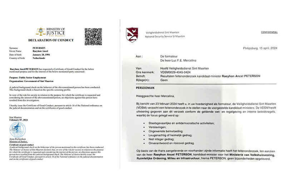 On the left the Certificate of Good Conduct issued for Rayhon Peterson, and on the right a letter from National Security Department DVSM stating that the screening of Candidate Minister Peterson has yielded nothing suspicious.