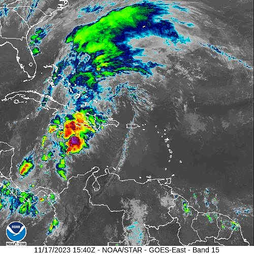 SPECIAL FEATURE: A tropical disturbance located in the west-central Caribbean Sea is moving toward the northeast at 14 mph with maximum sustained winds near 35 mph and higher gusts. Its potential to become a tropical cyclone is decreasing. Currently, there is no threat to St. Maarten.