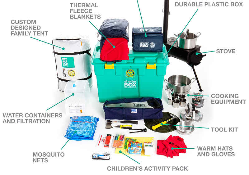Each of these "Shelterbox" shelters can house 10 people and is equipped with blankets, kitchen equipment, small materials, water treatment products, etcetera.