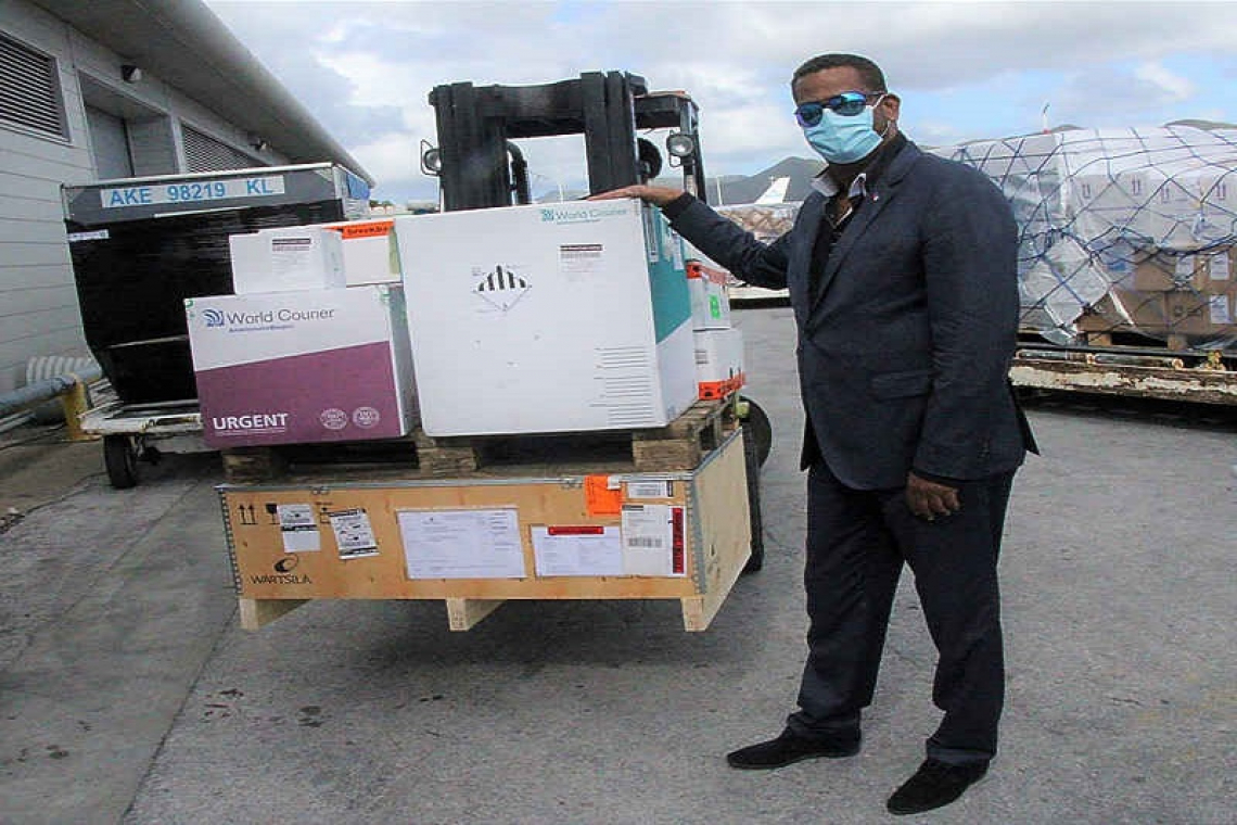 Minister of Public Health, Social Development and Labor VSA Richard Panneflek, was at the Princess Juliana International Airport (PJIA) when the shipment came in on a scheduled Royal Dutch Airlines KLM flight.
