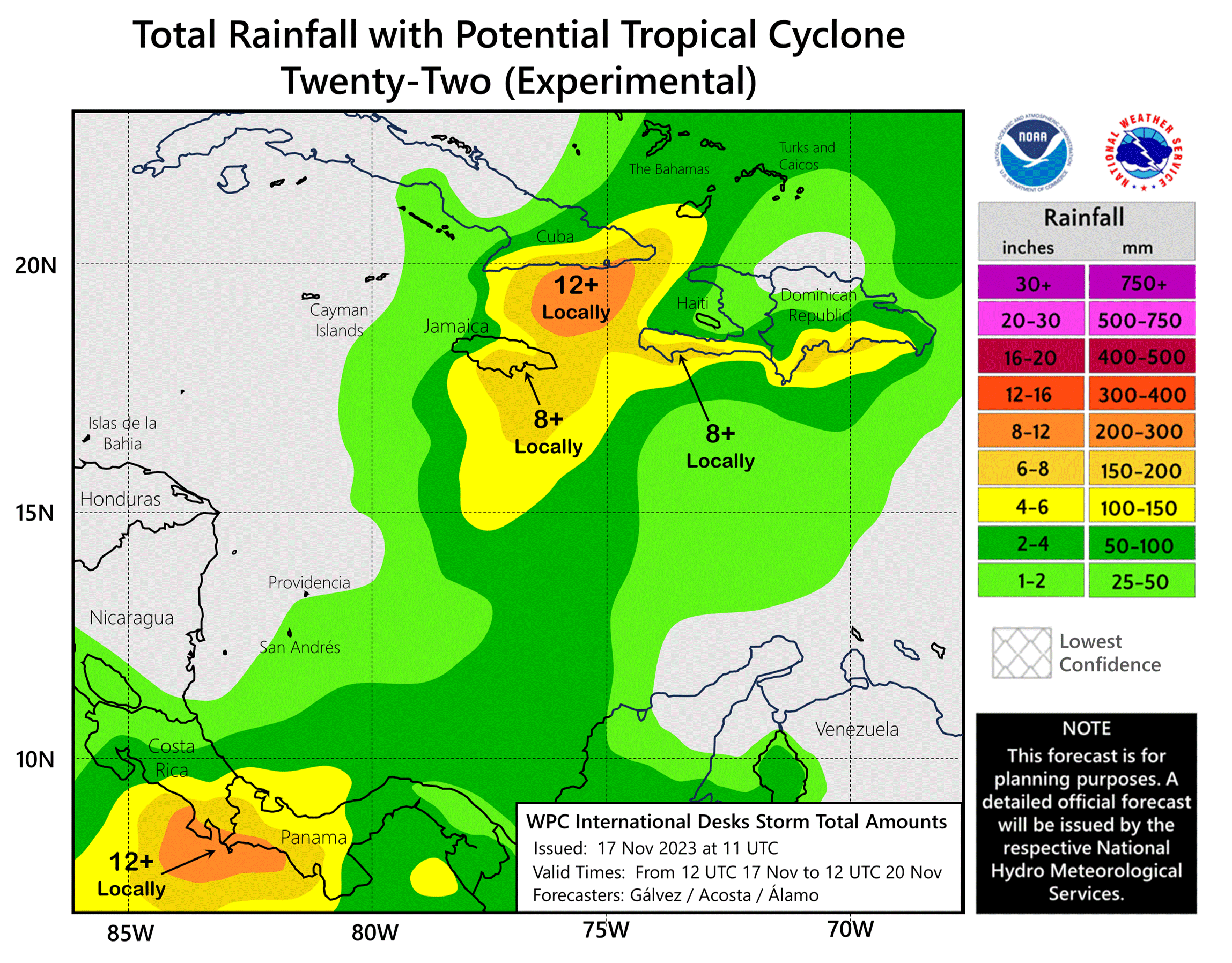 RAINFALL: Potential Tropical Cyclone Twenty-Two is expected to produce storm total rainfall of 5 to 10 inches with maximum amounts of 16 inches across portions of Panama, Costa Rica, Jamaica, southeast Cuba, and Hispaniola through Sunday morning. These rains are likely to produce flash flooding, along with mudslides in areas of higher terrain.