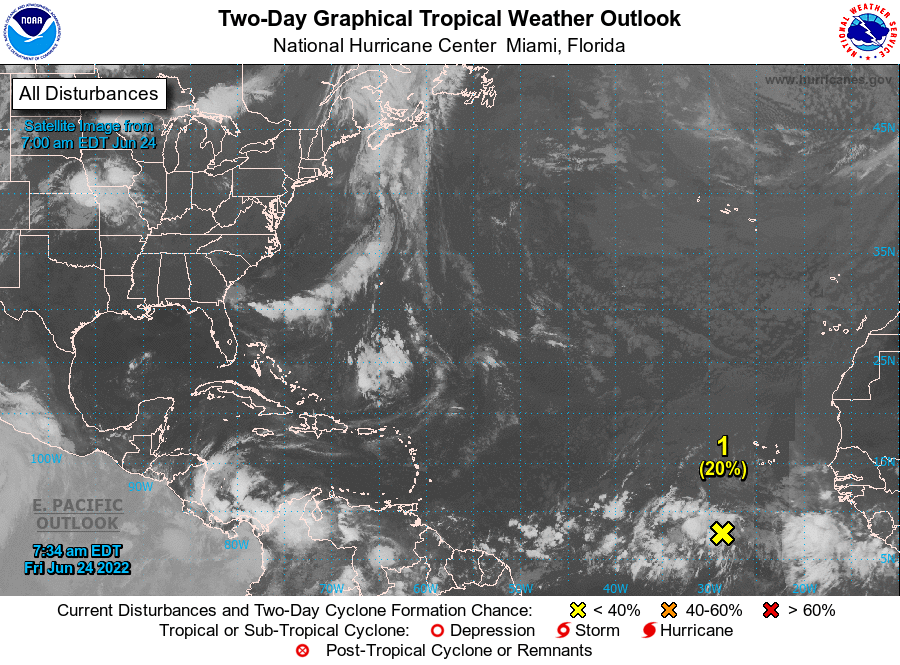 A tropical wave located over the eastern tropical Atlantic continues to produce a large area of disorganized showers and thunderstorms. Environmental conditions appear conducive for development of this system over the next few days, and a tropical depression could form during the early to middle part of next week while it moves westward at around 15 mph over the tropical Atlantic and approaches the Windward Islands.