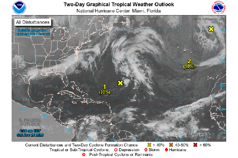 1. A non-tropical low pressure system located about 650 miles southeast of Bermuda is producing a few disorganized showers and thunderstorms to the north and east of the center. Environmental conditions are expected to be only marginally conducive for development during the next day or so as the low moves northeastward before it is absorbed by an approaching frontal system over the north-central Atlantic.