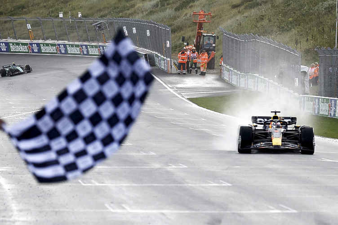 ZANDVOORT, Netherlands- Runaway Formula One leader Max Verstappen celebrated a record-equalling ninth successive victory after winning a rain-hit and red-flagged Dutch Grand Prix on Sunday for the third year in a row. The Red Bull driver's home triumph from pole position at a soggy Zandvoort equalled now-retired four-times world champion Sebastian Vettel's 2013 run of success with the same team. It was Red Bull's 14th consecutive triumph and 13th of the season, with the Italian Grand Prix at Monza following next weekend. Rain brought chaos at the end of lap one, with a further dry period followed by a downpour that swept in from the North Sea to halt proceedingsfor 40 minutes on the 65th of 72 laps with cars skidding off. Fernando Alonso put Aston Martin back on the podium with second place and a bonus point for fastest lap after the eventual rolling re-start behind the safety car led to a thrilling final chase at the seaside circuit. Pierre Gasly was third, his first podium finish since he joined Renault-owned Alpine, as Red Bull's Sergio Perez collected a five-second post-race penalty for speeding in the pit lane and dropped to fourth. Verstappen now leads Perez, his closest rival, by a mighty 138 points with nine races remaining. Red Bull lead Mercedes by 285 points with Aston Martin 40 points further back and 14 ahead of Ferrari. "Incredible. They didn't make it easy for us with the weather to make all the right calls," said Verstappen as his army of fans prepared to party into the night. "I already had goosebumps when they were playing the national anthem before the start," added the 25-year-old, who chatted happily with the Dutch king and queen before the podium ceremonies. "Even with all the bad weather, the rain, the fans are still going at it. So an incredible atmosphere." Verstappen's 11th victory of the season, and 46th of his career, provided another big push towards clinching a third title well before the end of the season. Ferrari's Carlos Sainz finished fifth with Lewis Hamilton sixth for Mercedes and fellow-Briton Lando Norris seventh for McLaren. Alex Albon collected more precious points for Williams in eighth, ahead of McLaren's Oscar Piastri and Esteban Ocon 10th for Alpine. New Zealander Liam Lawson finished 13th, and ahead of team mate Yuki Tsunoda, on his Formula One debut as a replacement for injured Daniel Ricciardo at AlphaTauri. Lawson overtook Charles Leclerc on lap 41, before the Ferrari driver retired with a damaged floor, but also collected a 10-second penalty for impeding in the pitlane. Clean Start Verstappen led cleanly away at the start with Alonso seizing third place. Only seven-times world champion Hamilton, starting a lowly 13th on the grid, lined up on medium tyres with everyone else on softs but all strategies were soon shredded as the skies opened. Perez, seventh on the grid and everything to gain, pitted immediately for intermediates along with six others as the leaders stayed out. The move paid off for him, but not for Ferrari who had Leclerc come in only to find no tyres ready and mechanics scurrying to bring them. Verstappen came in a lap later but resumed well down the field and set about closing the gap. He pitted again for dry tyres on lap 11 and took over at the front a lap later when Perez came in and discovered his team mate had successfully made the 'undercut' work. The weather played havoc with others' hopes, Mercedes' George Russell plunging from third on the grid to 18th on lap 13 and complaining over the radio. "I was forecast for a podium. How did we mess this up?" asked the Briton, who climbed back up the order but retired with a puncture after a clash with Norris at the re-start. The safety car was deployed from lap 16 to 21 when U.S. rookie Logan Sargeant crashed his Williams at turn eight. Verstappen appeared to be cruising to victory until the final deluge and the halt after Alfa Romeo's Guanyu Zhou crashed heavily, without injury.