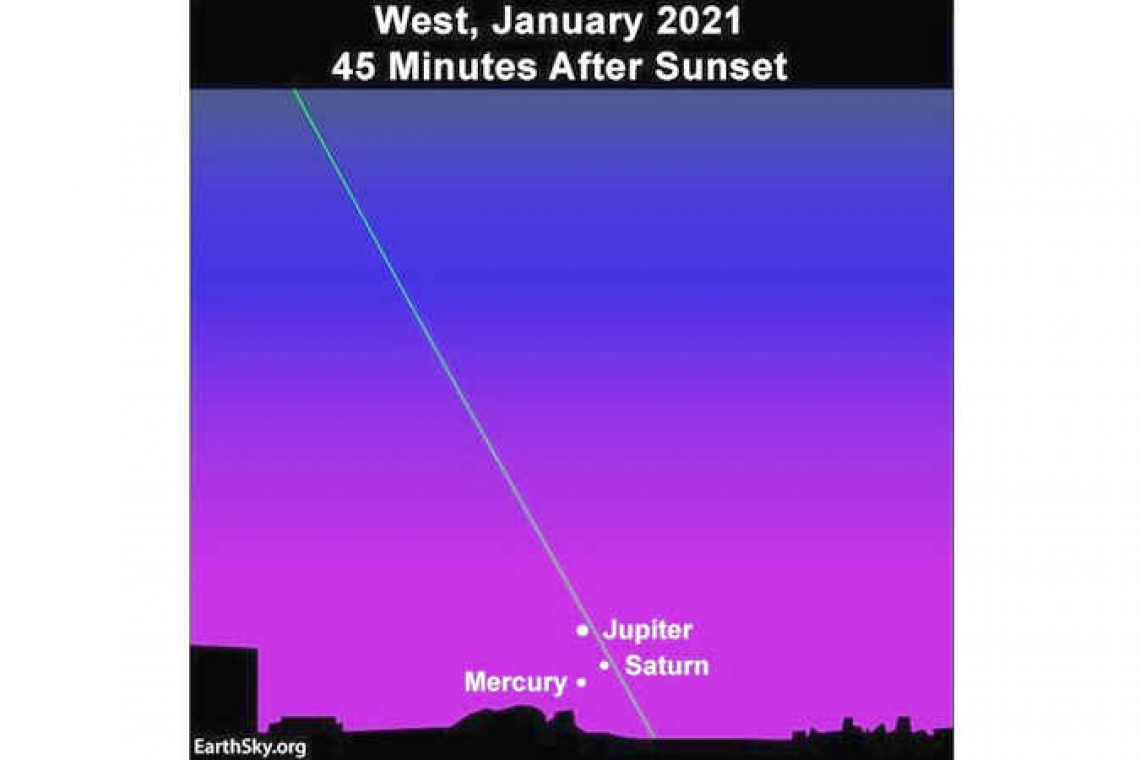This weekend, we can celebrate the new year with the sight of three planets all bunched up together on the sky’s dome. At dusk on the evenings of January 8, 9, 10 and 11, watch for the planets Mercury, Jupiter and Saturn to pop out low in the sky, rather close to the sunset point on the horizon. Jupiter is the brightest of the bunch, followed by Mercury and then Saturn. The tightest grouping of these worlds will be on January 10, 2021. Then Mercury will swing to the south of Jupiter on July 11, 2021, as shown on the chart.