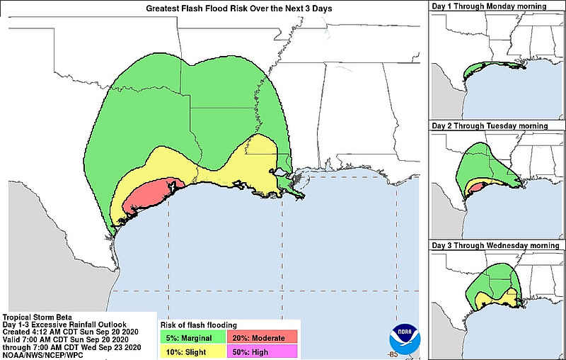 RAINFALL: Through Thursday, Beta is expected to produce rainfall accumulations of 8 to 12 inches with isolated totals of 20 inches from the middle Texas coast to southern Louisiana, with 4 to 8 inches spreading northward into the lower Mississippi River Valley by mid-week. Flash and urban flooding is likely, as well as minor to isolated moderate river flooding.
