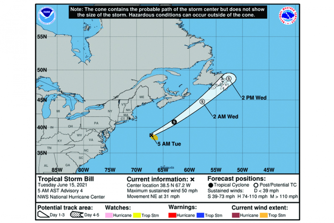 At 500 AM AST (0900 UTC), the center of Tropical Storm Bill was located near latitude 38.5 North, longitude 67.2 West. Bill is moving rapidly toward the northeast near 31 mph (50 km/h), and this general motion is expected to continue through Wednesday.