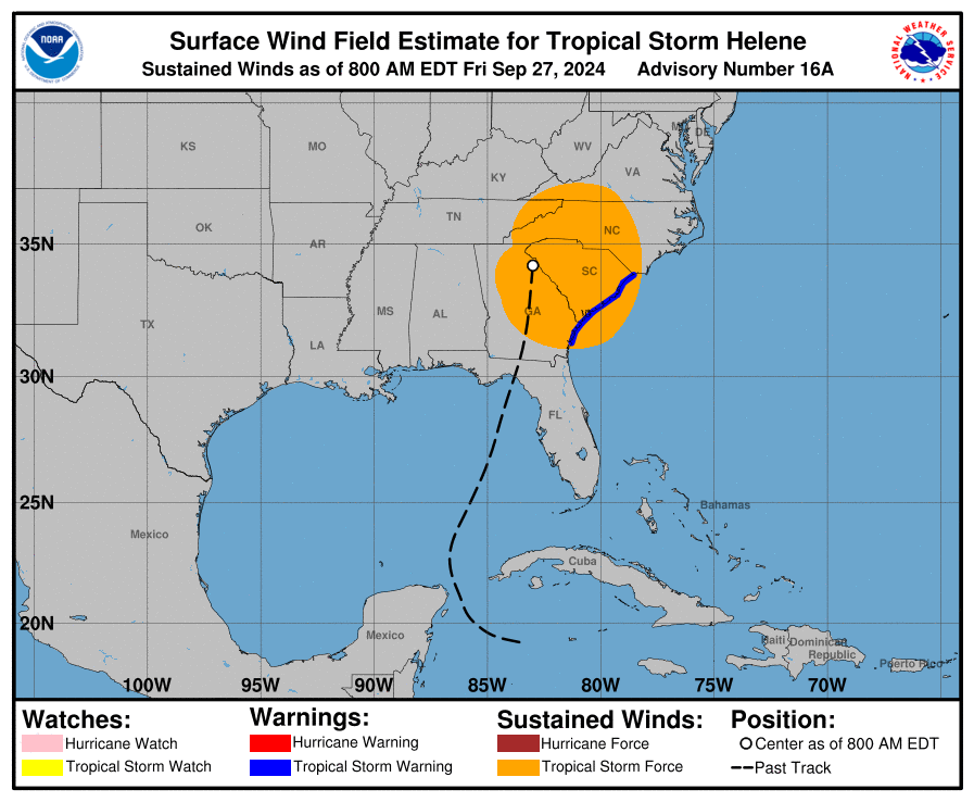 Los vientos máximos sostenidos han disminuido a cerca de 60 mph (95 km/h) con ráfagas más fuertes. Se espera un debilitamiento continuo, y se espera que Helene se convierta en una baja post-tropical esta tarde o esta noche. Sin embargo, las ráfagas de viento dañinas penetrarán tierra adentro a través del sureste de Estados Unidos, incluyendo sobre el terreno más alto de los Appalaches del sur.