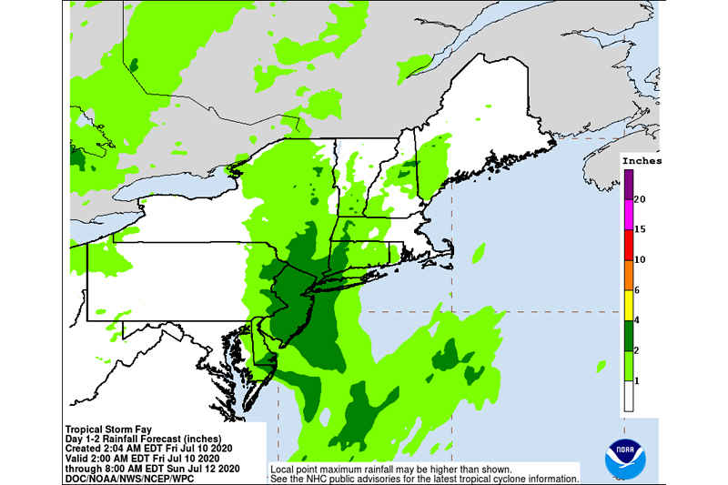 RAINFALL: Fay is expected to produce 2 to 4 inches of rain with isolated maxima of 7 inches along and near the track from the lower Maryland Eastern Shore and Delaware northward into New Jersey, eastern Pennsylvania, southeast New York, and southern New England. These rains may result in flash flooding where the heaviest amounts occur. Widespread river flooding is not expected at this time.